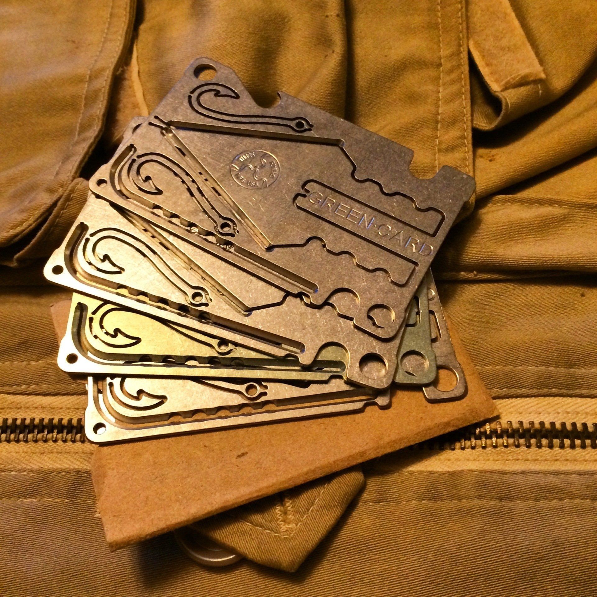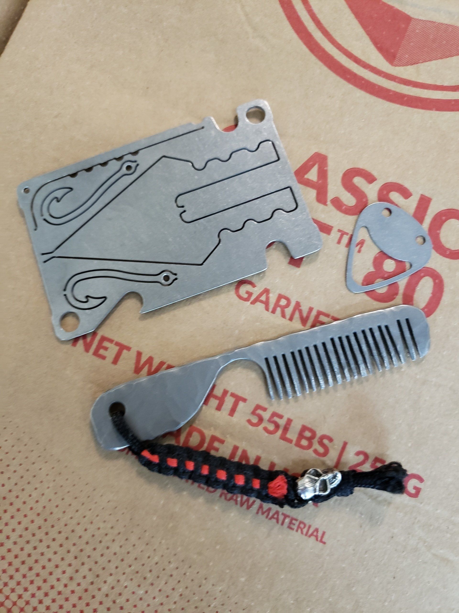 Our two Flow waterjets have cut hundreds of thousands of parts in many industries beyond the knife industry. We are proudest of cutting gun ports in 150 lb. 3" thick bulletproof glass windows for the US military's Cougar HEV trucks used in Iraq. Our waterjets have cut survival tools, pry bars, 3” thick stainless steel medical fixtures used in surgery, mustache combs, bottle openers, model train tracks, guitar picks, earrings and hundreds of thousands of titanium pocket clips.